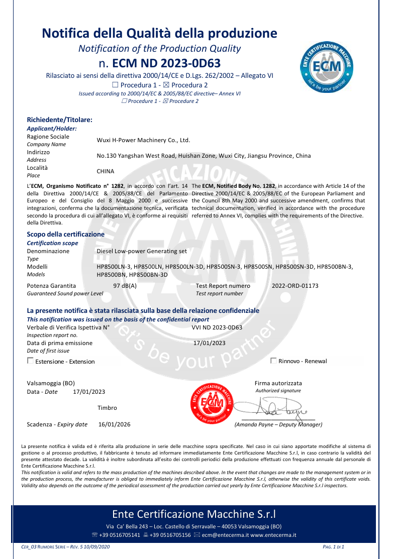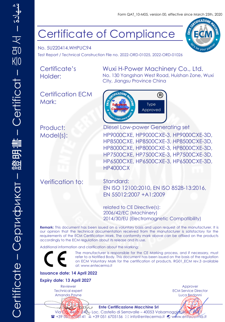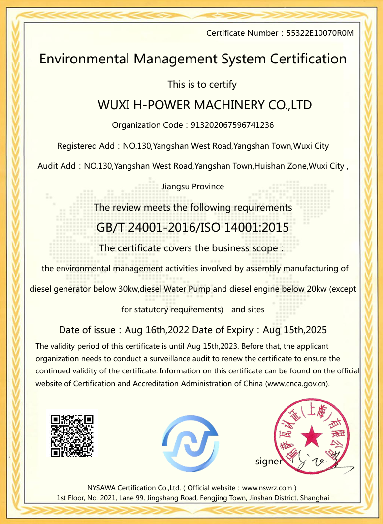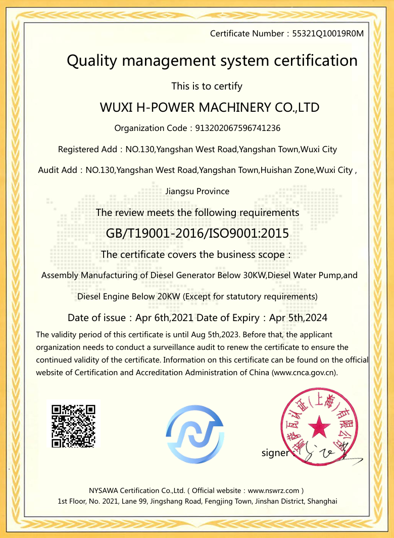 We have passed certification of ISO9001:2000 quality management system. Our products of generator sets , construction machines have been certificated by EPA, CARB,2004/26/EC, and CE. It enables the selling in different markets expediently and simply.